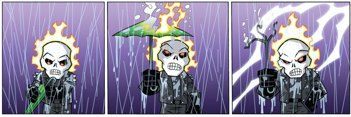A Ghost Rideres tényleg jópofa, csak eszembe jutott, hogy semmi értelme. A lángot amúgy sem oltja el az eső, mire neki esernyő? :D